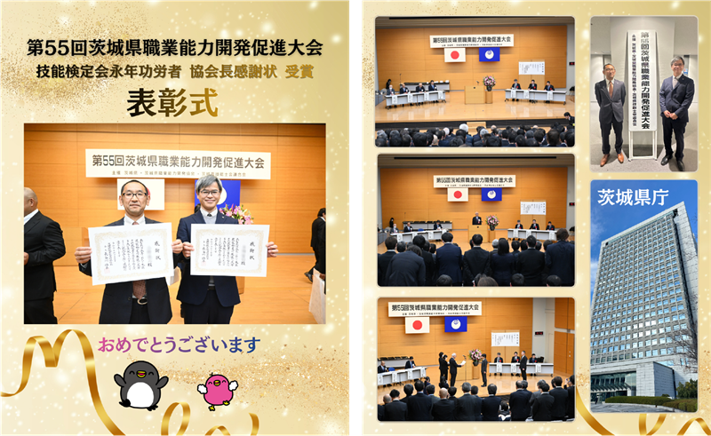 2025年11月26日(水)、茨城県庁にて開催された「第55回 茨城県職業能力開発促進大会」において、弊社アビリカの技術者2名が、長年にわたり技能検定制度の発展に寄与した功績が認められ、茨城県職業能力開発協会 会長感謝状(技能検定功労)」を受賞いたしました。